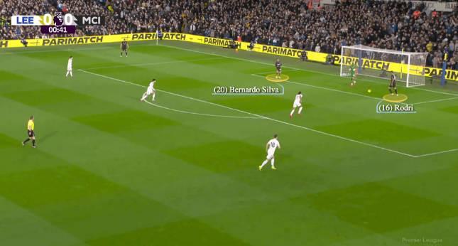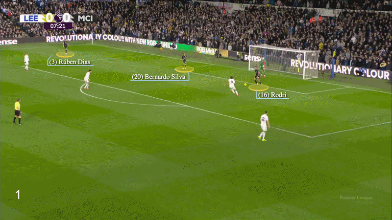 第三次尝试几乎完美地展现了瓜迪奥拉想要的效果,罗德里和B席吸引了利兹联球员的注意力,然后绕过他们,带球推进到前场并进行传球配合。